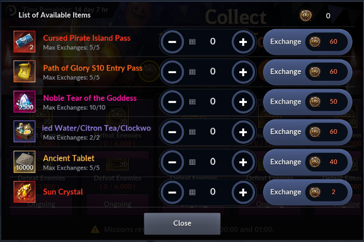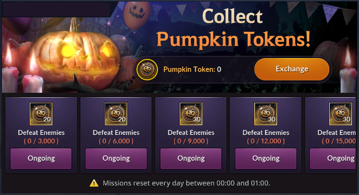 - Obtain Pumpkin Tokens by completing missions that reset every day between 00:00 and 01:00.