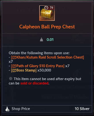 | Daily Mission x15 | Calpheon Ball Prep Chest |