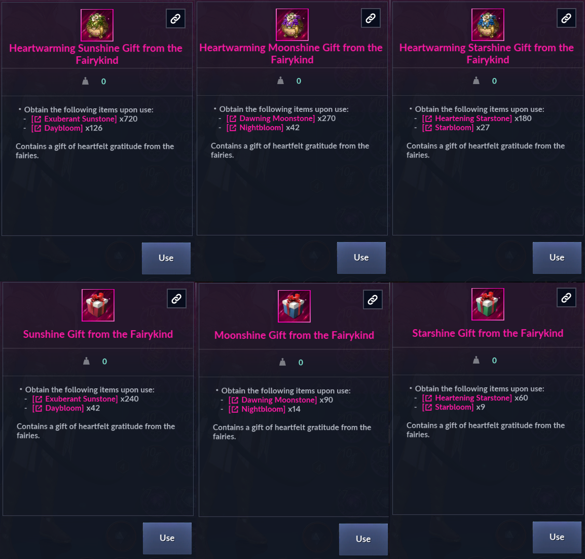 Fairy's Flower Buds can be rescued by closing the Chaos Rifts, and Adventurers can obtain "pwesents of gwatitude" from the fairies, which contain materials to enhance or upgrade the Fairy Brooches.
