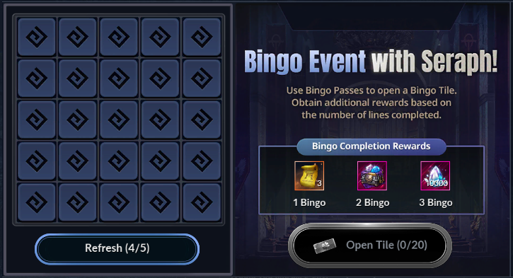 - Use 20 Bingo Passes to open 1 random Bingo Tile and receive a random reward.