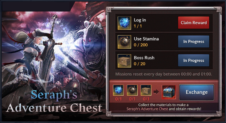 - Collect all 3 materials to exchange them for Seraph's Adventure Chest x1.
