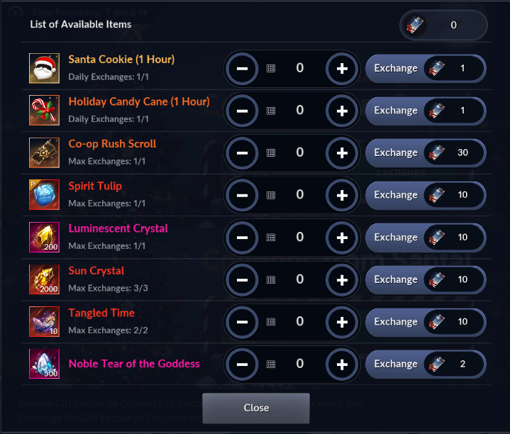 - Obtain "Gift Exchange Coupons" from your in-game mailbox every day and exchange them for the rewards you desire.