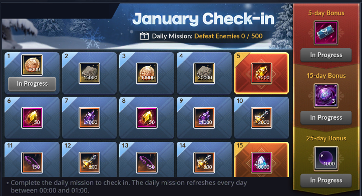 - Earn additional rewards by checking in for 5/15/25 days.