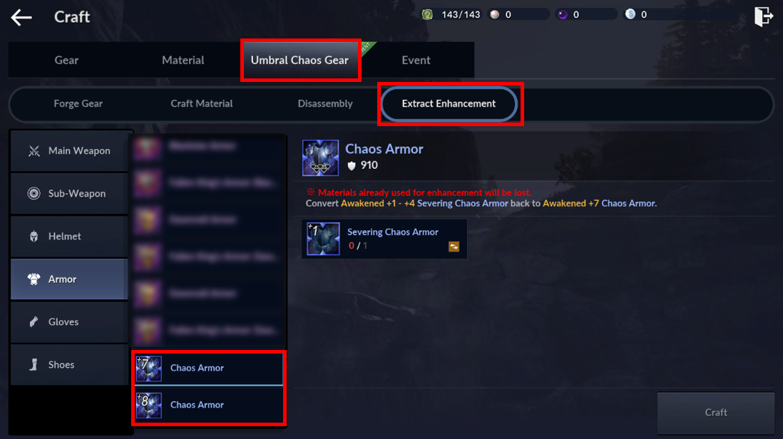 ㆍEnhanced Umbral Chaos gear can now be converted back to ordinary gear at [Menu] - [Craft] - [Umbral Chaos Gear] - [Extract Enhancement].