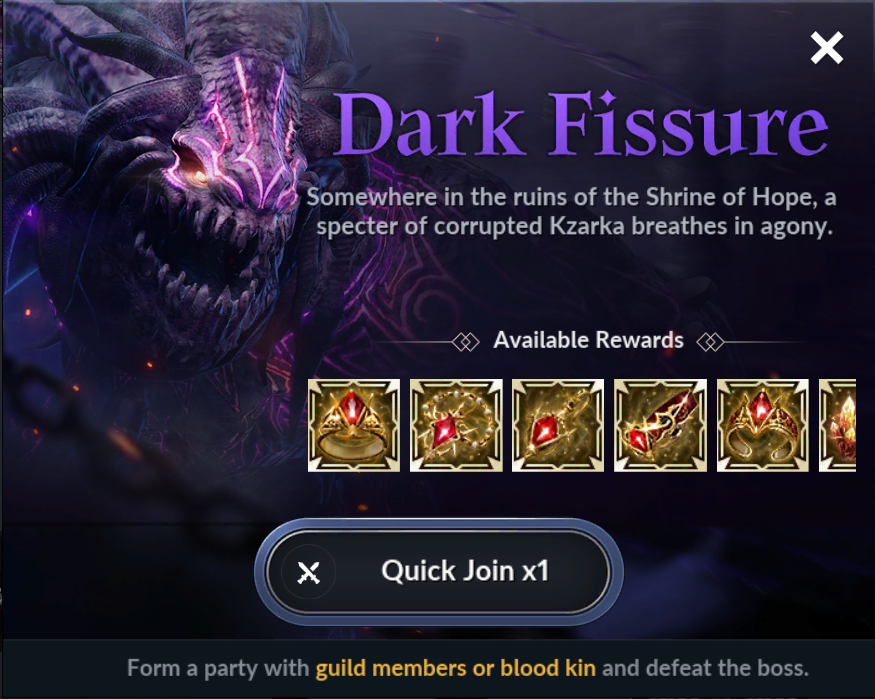 ㆍSpoils of Dark Fissure is available if you missed the battle against Kzarka during the Dark Fissure.