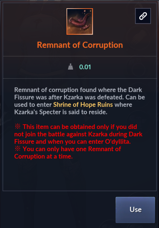 - Interact with Spoils of Kzarka to obtain Remnant of Corruption x1.