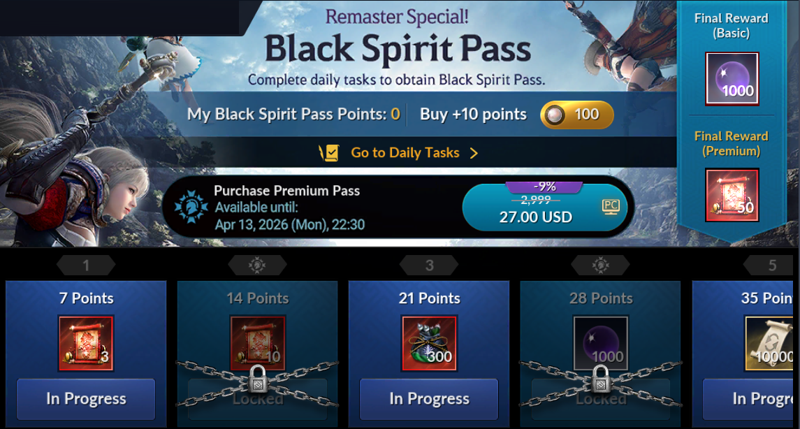 - Black Spirit Pass Points are not consumed upon claiming the rewards.