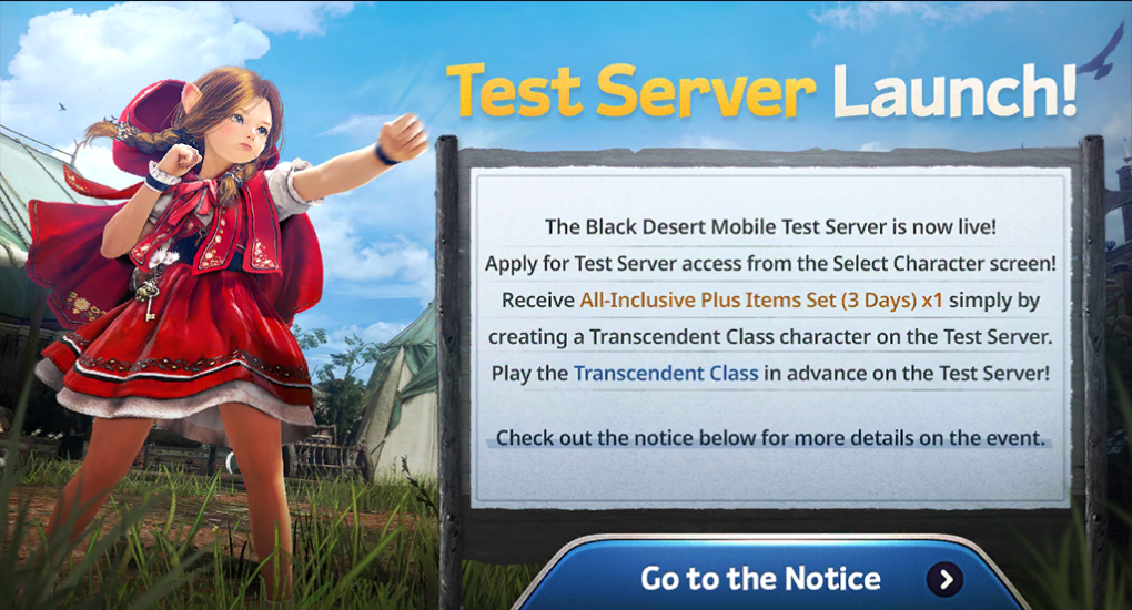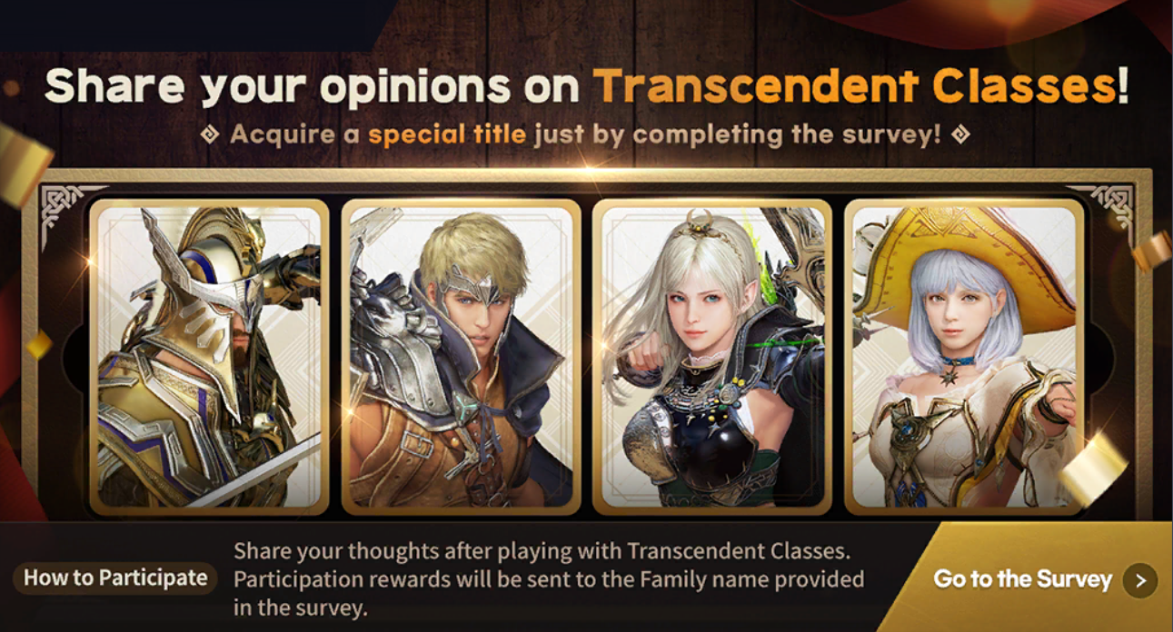 On the test server, use the [Go to the Survey] button in the event banner shown above to share your impressions of the Transcendent Class through the survey.