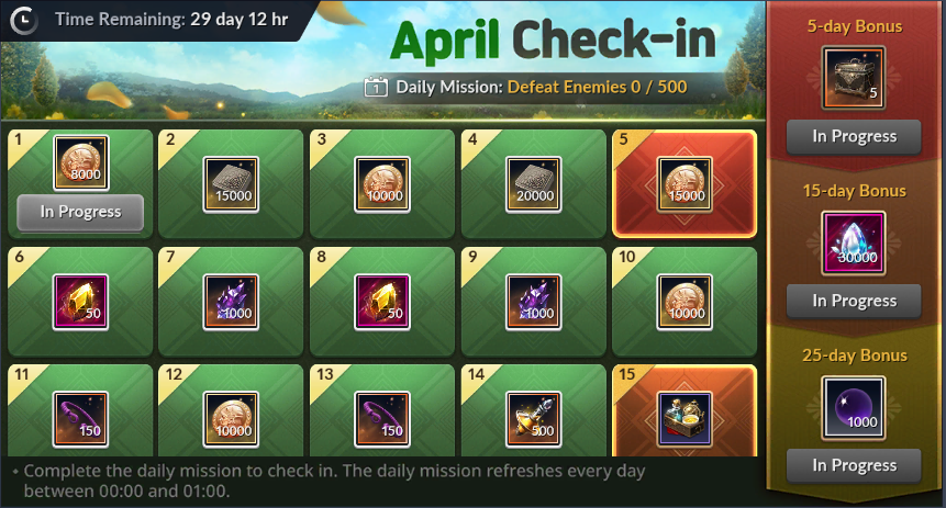 Complete the daily mission to check in. Obtain rewards for each day you check in.