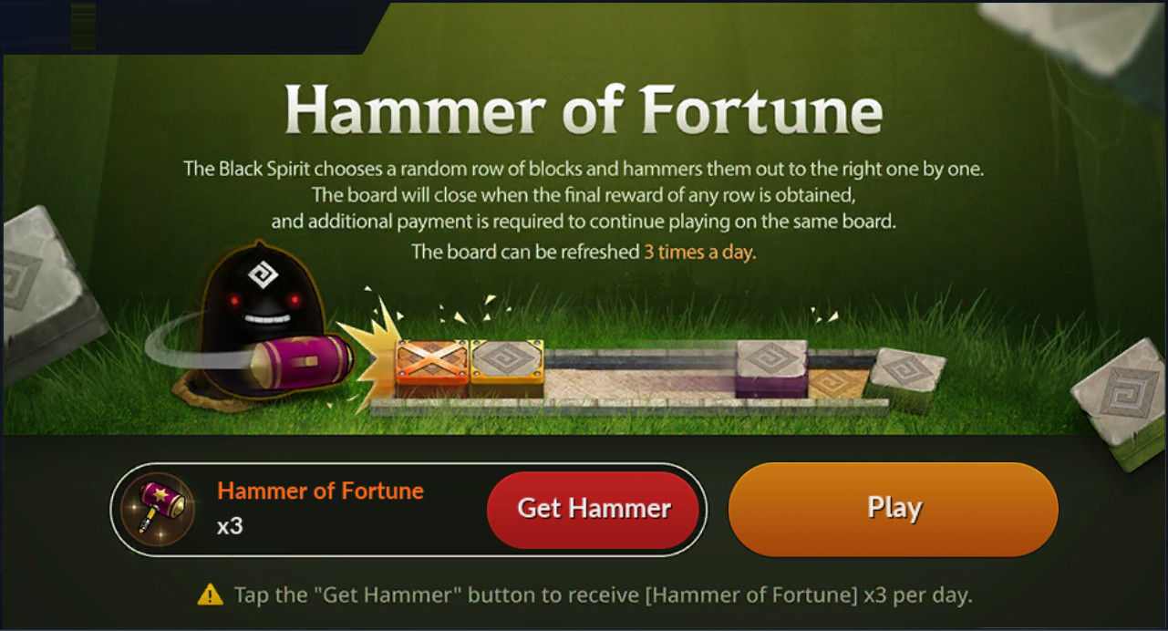 - When you tap the [Push Block] button, the Black Spirit hammers and pushes one of the four rows, and you obtain the reward farthest to the right.
