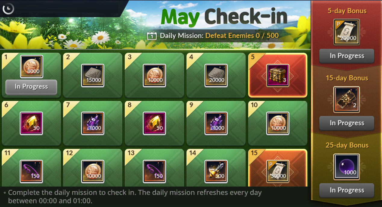 Earn additional check-in rewards by checking in for 5, 15, or 25 days!