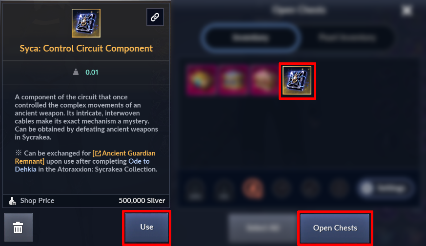 ② Use the item "Syca: Control Circuit Component" or tap "Open Chests" in the inventory.
