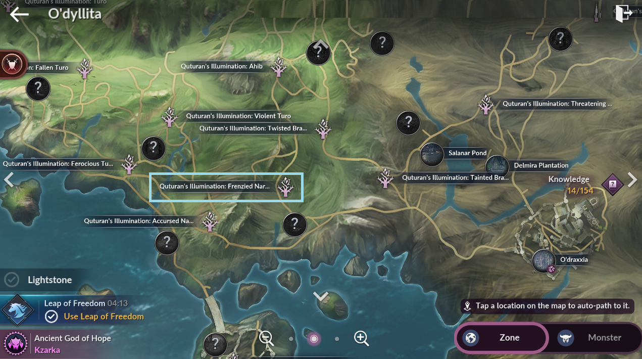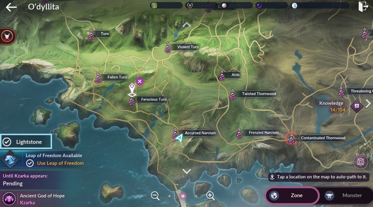 - Toggle [Lightstone] on the O'dyllita World Map to browse all Condensed Lightstones. Tap on the Lightstone icon to check its current status.