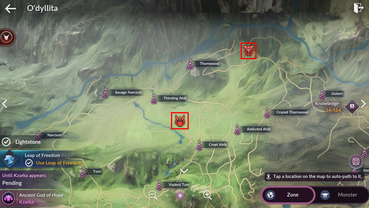 ㆍ Auto-path is also available through the hyperlink [Kzarka's destination] in the pop-up window displayed when tapping the [Ancient God of Hope Kzarka] banner on the bottom left of the World Map.