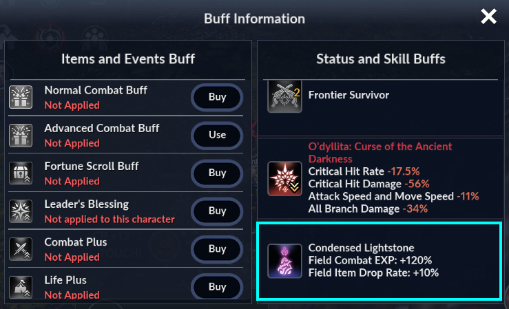 ㆍExamples of item buffs: Normal/Advanced Combat Buffs, Normal/Advanced Combat EXP Buffs, Fortune Scrolls