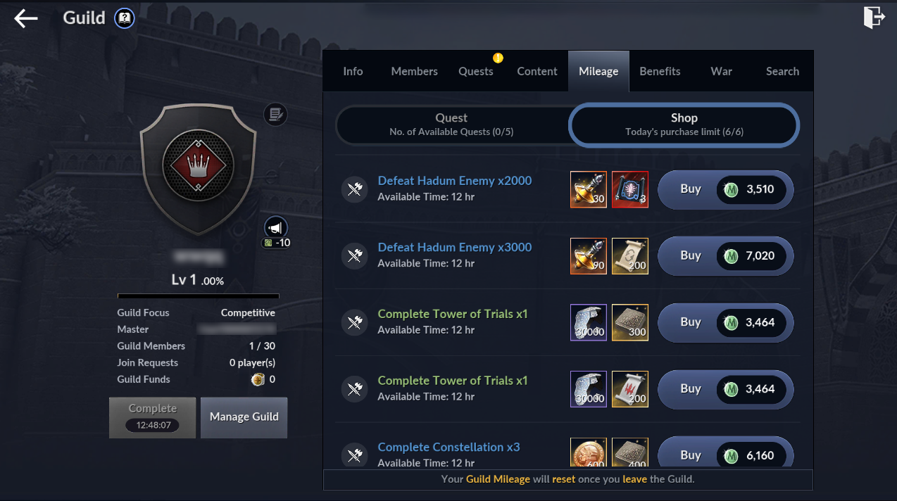 Comprehensive details regarding the purchase cost and corresponding rewards for each "Guild Mileage Task" can be viewed via the game UI.