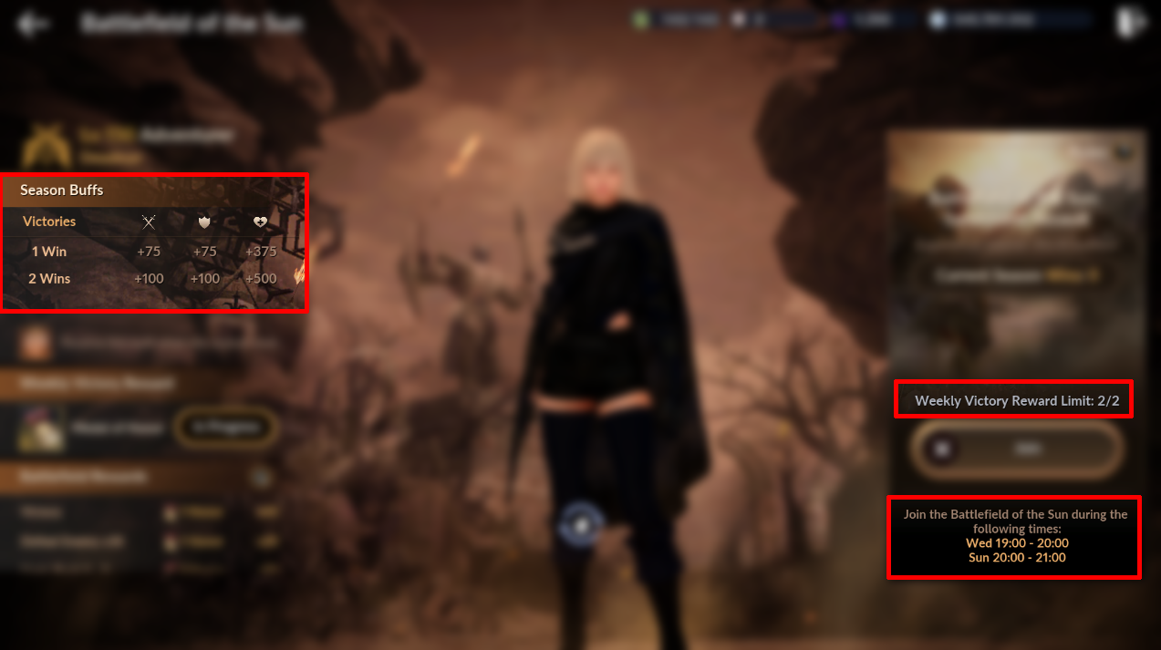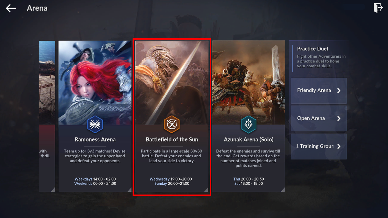 - When the Battlefield of Sun opens, go to [Menu > Arena > Battlefield of the Sun] to access the lobby and join a battle.