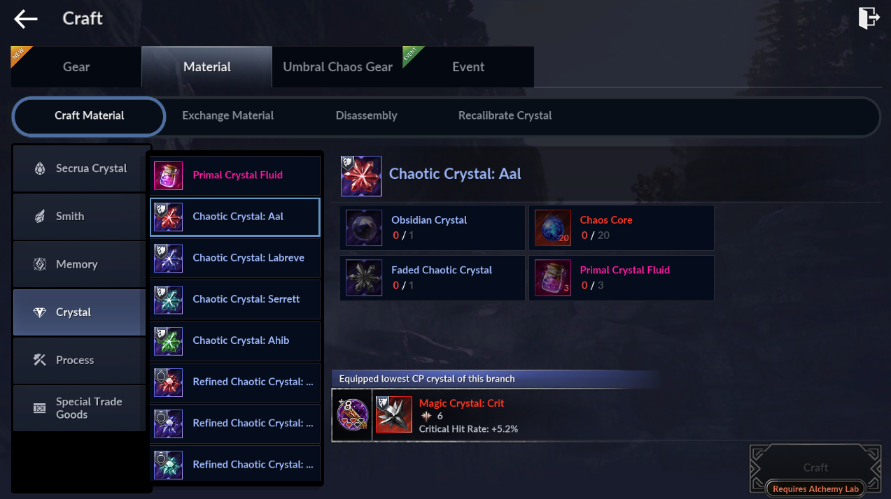 | Chaotic Crystal | Obsidian Crystal x1 Faded Chaotic Crystal x1 Chaos Core x20 Primal Crystal Fluid x1 |