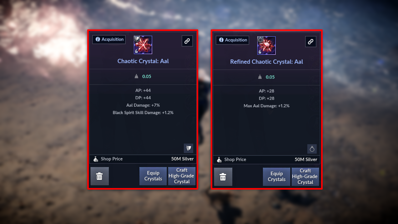| Chaotic Crystal | AP: 36 - 47 DP: 36 - 47 Crafted Crystal Branch Damage +7% Black Spirit Skill Damage +1.2% or PvP Damage Reduction +0.6% |