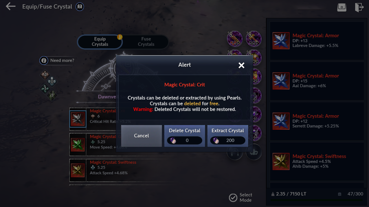 Crystals can only be deleted or extracted by spending Pearl.